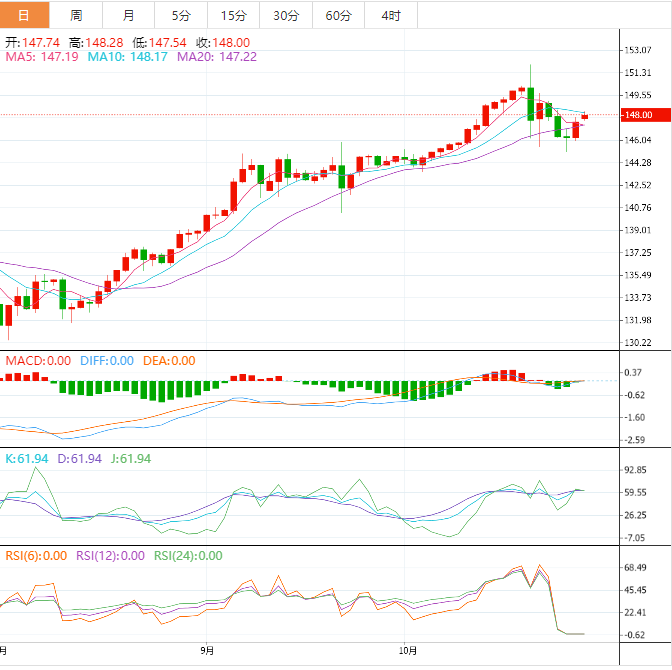 今日外汇市场走势分析 周二盘中,美元指数微跌,目前交投于111.52附近。美元周一全线上涨,收复本月稍早的部分失地,因预期本周四美联储召开货币政策会议时将再次大幅加息。美元兑日元收涨0.86%,报148.74。汇价10月份上涨2.72%,连续第三个月上涨。英镑兑美元收跌1.31%,报1.1460。英国央行可能会在周四的会议上加息