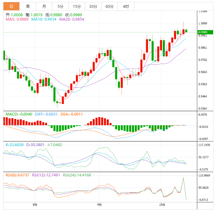 美元兑瑞郎在周四震荡后,在平价附近震荡。周五,美元兑瑞郎触及今年以来高点1.0074,随后回落至当前汇率水平,尽管美国通胀数据证明美联储将进一步收紧货币政策。截止目前,美元兑瑞士法郎的交易价格为1.0009,比开盘价高出0.04%。 美元/瑞士法郎价格预测 日线图显示,该货币对偏向上行,不过自9月中旬至整