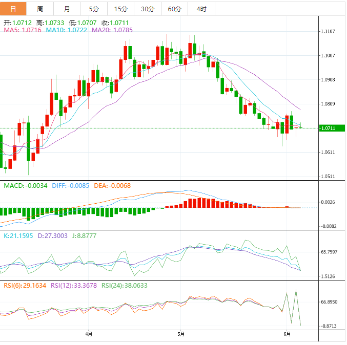 周二盘中,欧元兑美元下跌至1.0712,跌幅0.01%。 欧元基本面:悲观的美国I服务业I公佈后美元指数下跌。不像美国制造业採购经理人指数(I),服务业I维持在50上方,但走低至50.3。与此同时,随著欧元区4月零售销售即将公佈,欧元料出现巨大行情。预计该数据月率增长0.2%,前值下降1.2%。预计年率下降1.8%,前