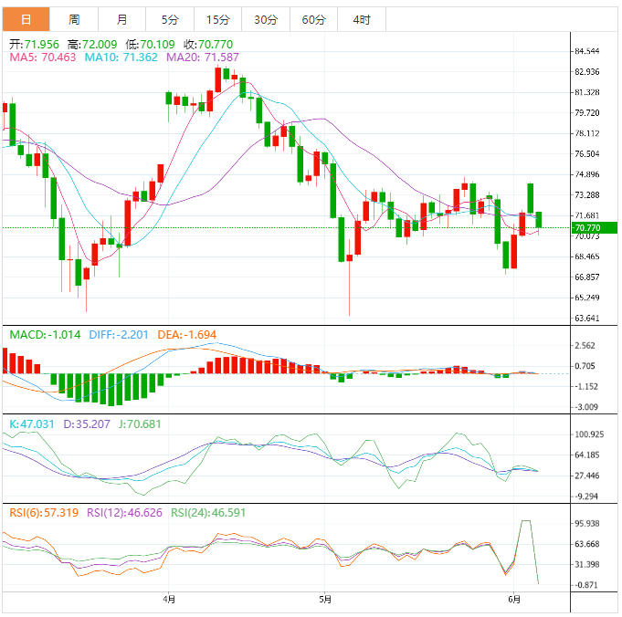 周二盘中,现货黄金窄幅震荡,目前交投于1958.53美元/盎司,隔夜美国I非制造业I数据表现差于预期,市场进一步强化了美联储6月份暂停加息的预期,美元指数承压,给金价提供支撑,不过,美国债务违约风险排除后,美国持续上涨,也打压黄金的避险需求,令多头有所顾忌。 美原油小幅走弱,目前交投于71.30美元/桶附近
