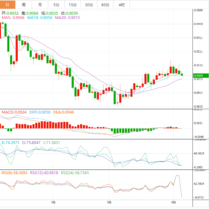 周二盘中,美元兑瑞郎下跌至0.9042,跌幅0.12%。 基本面上,美元/瑞郎延续前日跌势,空头试探了一个月前的上升支撑线0.9050附近。美元广泛下跌使得货币对连续第二日下跌,同时其走势印证了乐观的瑞士通胀率数据。展望未来,由于在美联储6月13-14日的货币政策会议前有15天的静默期,数据清淡以及没有美联储的讨论将限