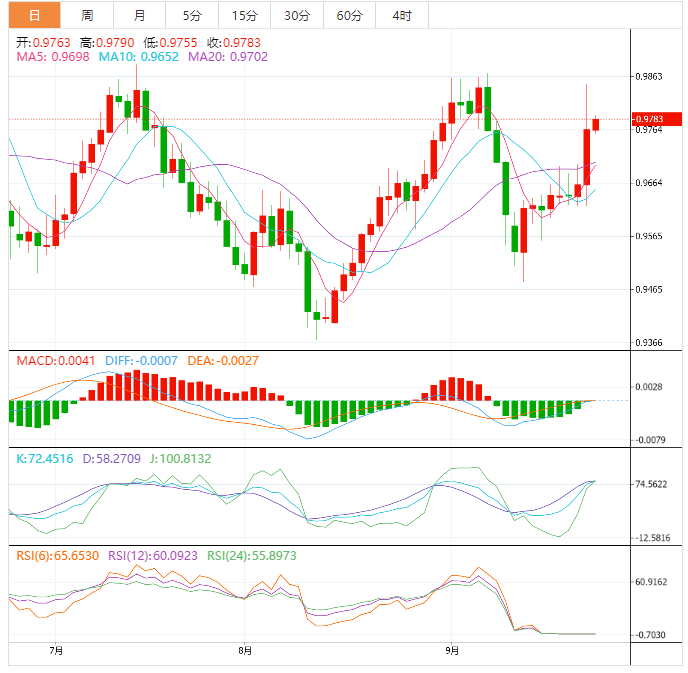 周五盘中,美元兑瑞郎上涨至0.9786,涨幅0.20%。 基本面上,在瑞士央行周四早些时候宣布其政策决定后,美元兑瑞郎受到了积极的买盘,并在欧洲午盘继续走高。这种势头将现货价格推升至两周新高,但仍停留在8月和本月稍早测试的阻力区0.9860-0.9870下方。瑞士央行将政策利率上调75个基点,与市场普遍预期一致,不过一些