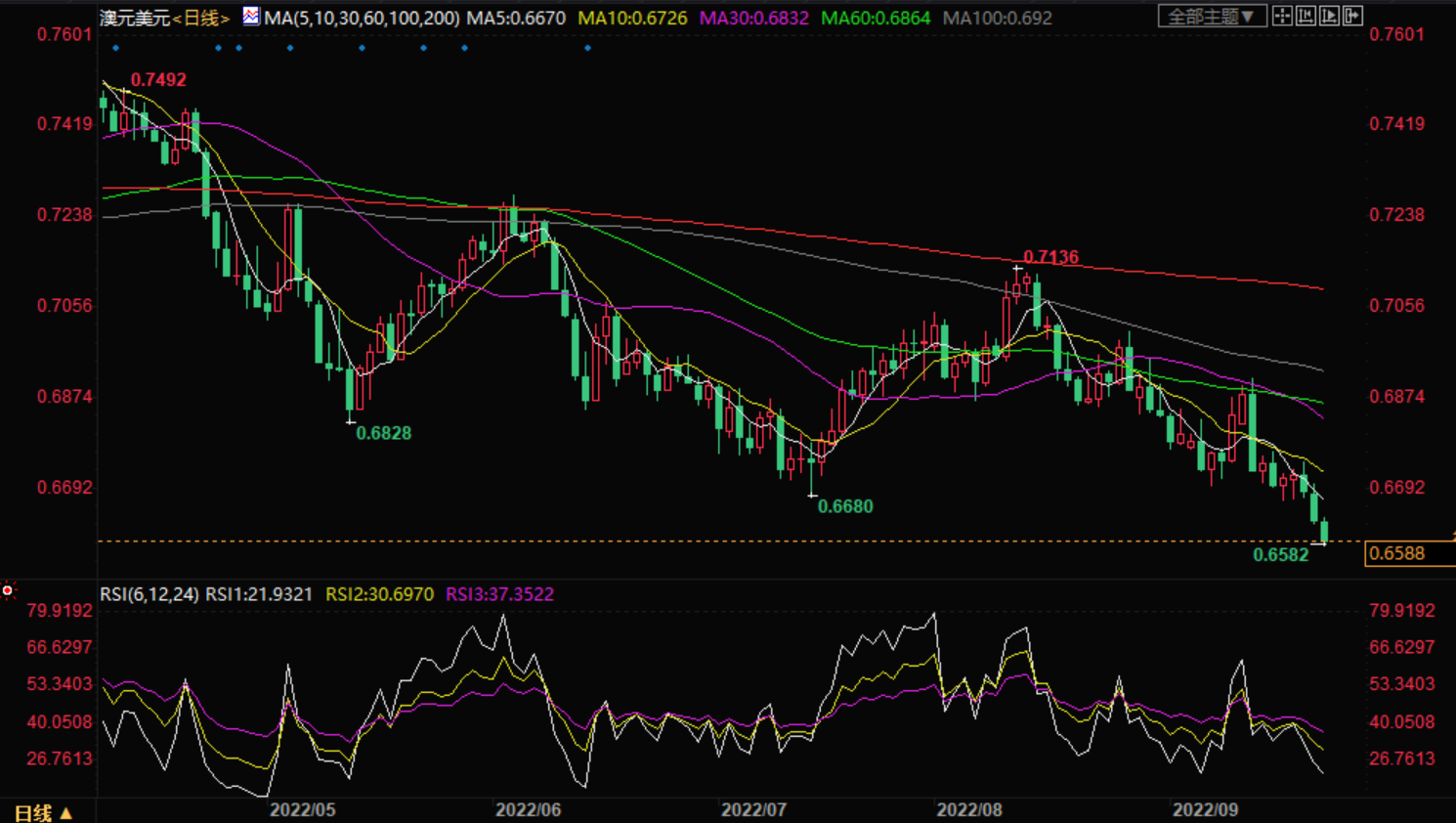 澳元兑美元已经跌破关键支撑位0.6600,在美国联邦储备委员会(美联储)宣布利率决定后,资产像纸牌屋一样下跌。澳元兑美元延续了连续两天的下跌势头,已经跌破了本轮支撑位0.6600。预计澳元兑美元将在0.6500的心理支撑位附近找到缓冲。 澳元兑美元汇率走势基本面解读 市场参与者此前已消化了美联储连续第三次加息75