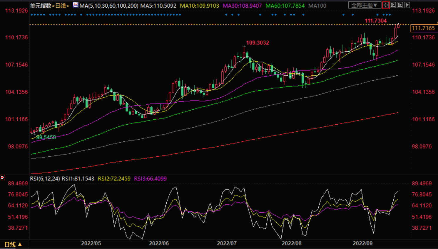 美元指数在周四亚洲交易时段升至111.65,刷新了20年来的高点。在此过程中,美元兑六种主要货币的指标连续第三天上升,触及2002年中期的水平。 美元指数最新反弹可能与美国国债收益率有关,因为债券券息在从前一天的多年高点回落后,重新获得了上行势头。也就是说,美国10年期国债收益率反弹向前一天创下的11年高点,