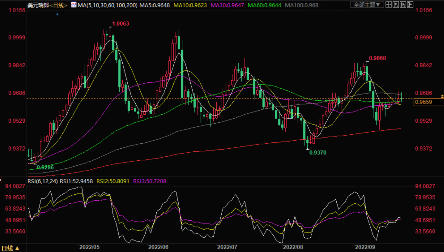 美元/瑞郎整理于0.9660附近,继波动指标明显上升后,波动率出现回落。美元/瑞郎震荡于0.9620-0.9700的极端区间内,并继美联储决议公布后,投资者忙于分析美联储决议以明确市场方向,美元/瑞郎处在盘整当中。 基本面上,美联储已将利率目标定为4.6%,并希望到2023年底达到4.4%,远高于此前预期的高水平3.8%。这一政策