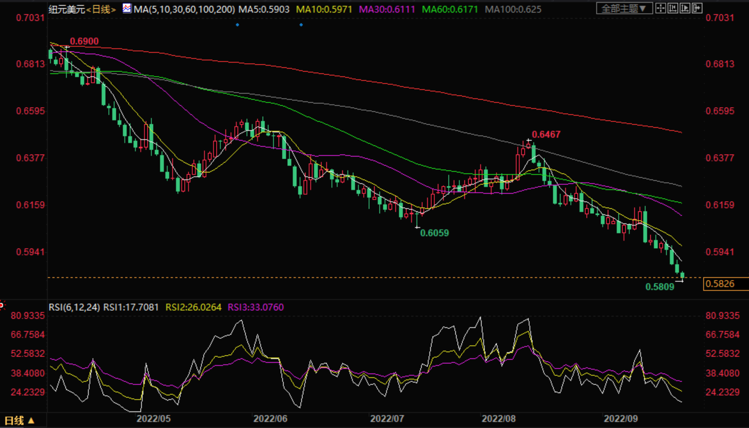 纽元/美元下跌跌至0.5810,刷新30个月低位。在这期间,纽元/美元延续前日跌破四个月支撑,以及2020-21年上行趋势的78.6%斐波位的势头。 基本面上,根据《华尔街日报》的美元指数(衡量美元兑一篮子世界主要货币的汇率),美元达到了十多年来的最高水平。1美元可以买到自上世纪90年代初以来最多的日元,英镑兑美元最近