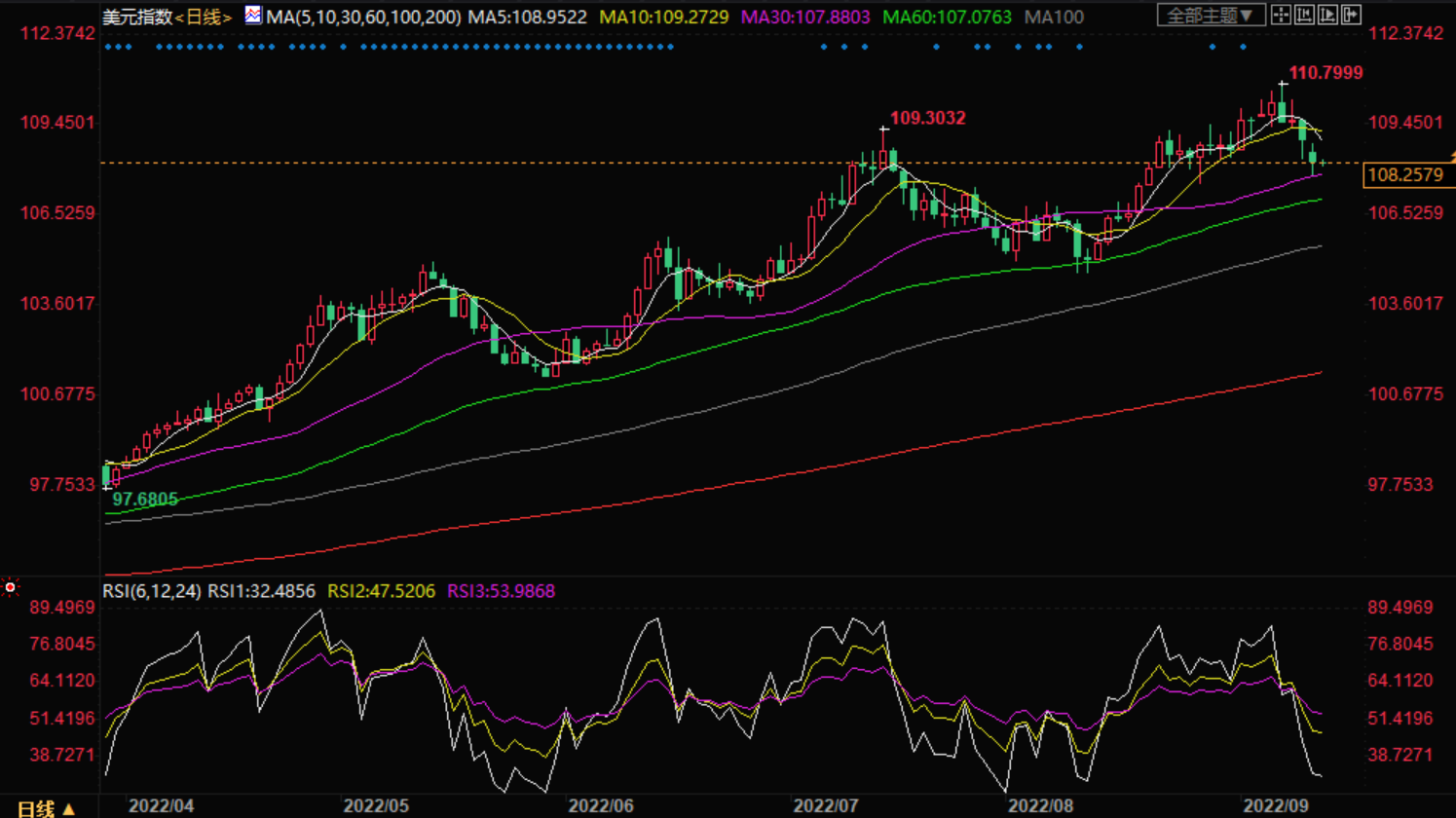 周五(9月9日)欧洲市场盘中,美元重挫,此前欧洲央行发表了鹰派言论,引发交易员重新评估全球加息预期,同时日本央行行长就日元贬值表示不满。 截至目前,美元指数跌1.09%,报108.51,本周初曾触及20年高点110.79。美债基准收益率美国10年期国债收益率报%。 美联储主席鲍威尔周四重申美联储”坚定地致力于”控制通