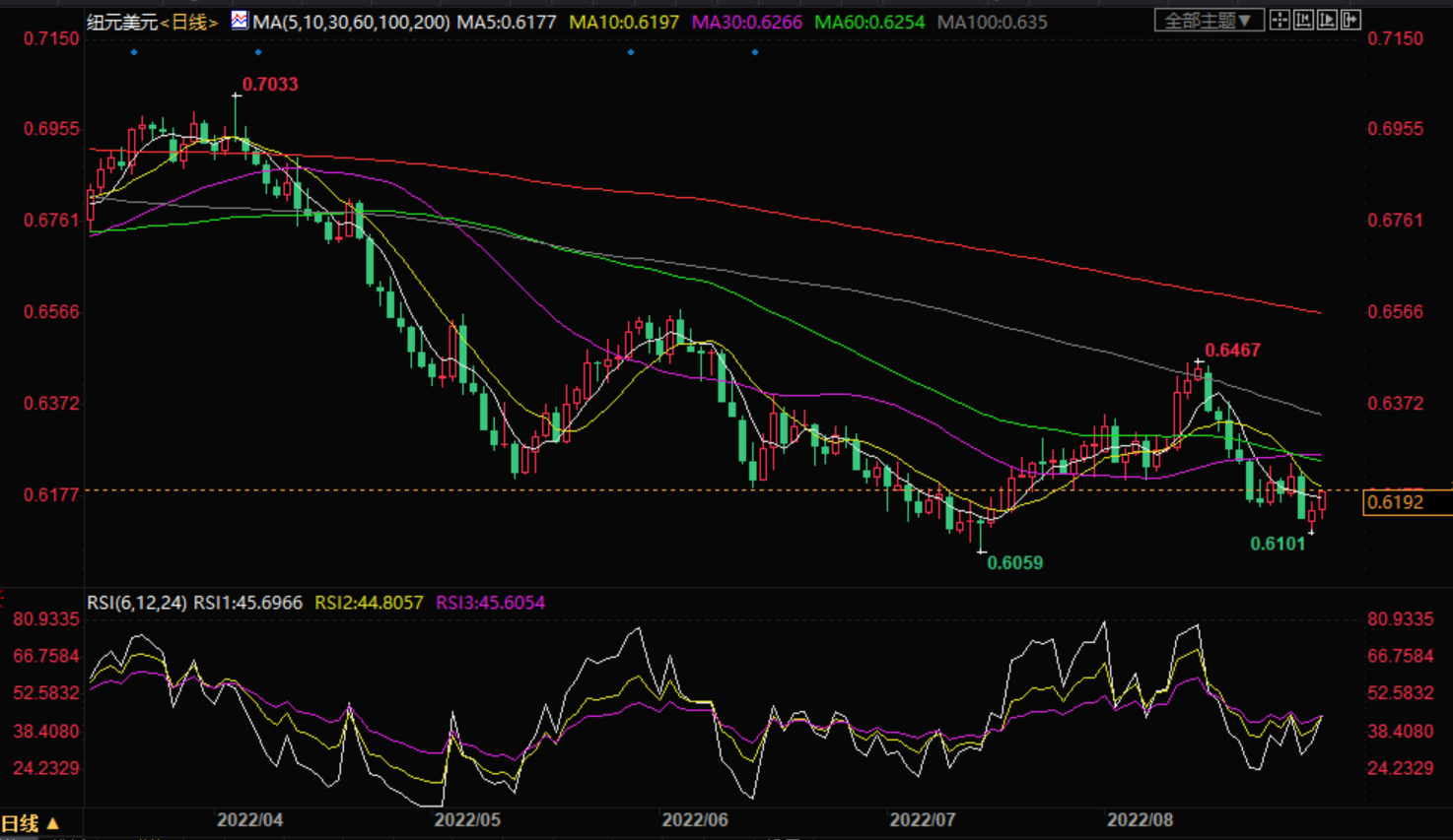周二盘中,纽元兑美元下跌至0.6146,跌幅0.07%。 基本面上,目前反映出美联储在9月议息会议上大幅加息75个基点的可能性加大。美国国债收益率的进一步上升强化了市场预期。这种情况,加上避险情绪,将避险的美元推至20年来的新高,并促使资金逃离风险敏感的纽元。美国没有发布任何影响市场的主要经济数据,这使得纽元