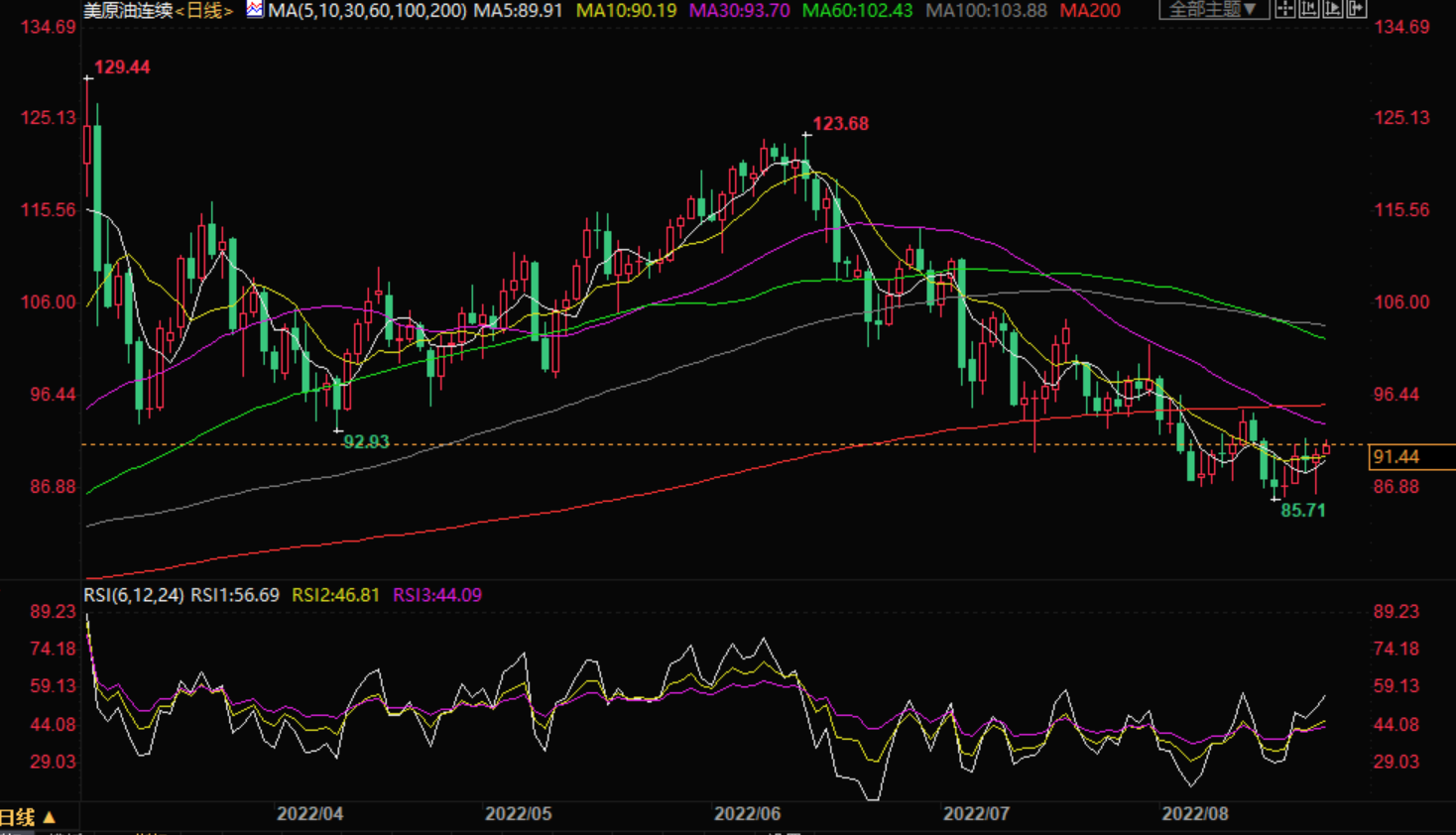 周二,现货黄金低位徘徊,目前交投于1736美元附近,距离隔夜创下的近四周低点不远,美元指数再度刷新逾五周高位,而且距离近20年高点不远,对金价打压明显,而且越来越多的分析认为美联储杰克森霍尔研讨会发出鹰派信息,这令黄金多头退却。 美原油震荡上涨,最高触及91.77美元/桶,虽然美股大跌、美元持续走强、欧元