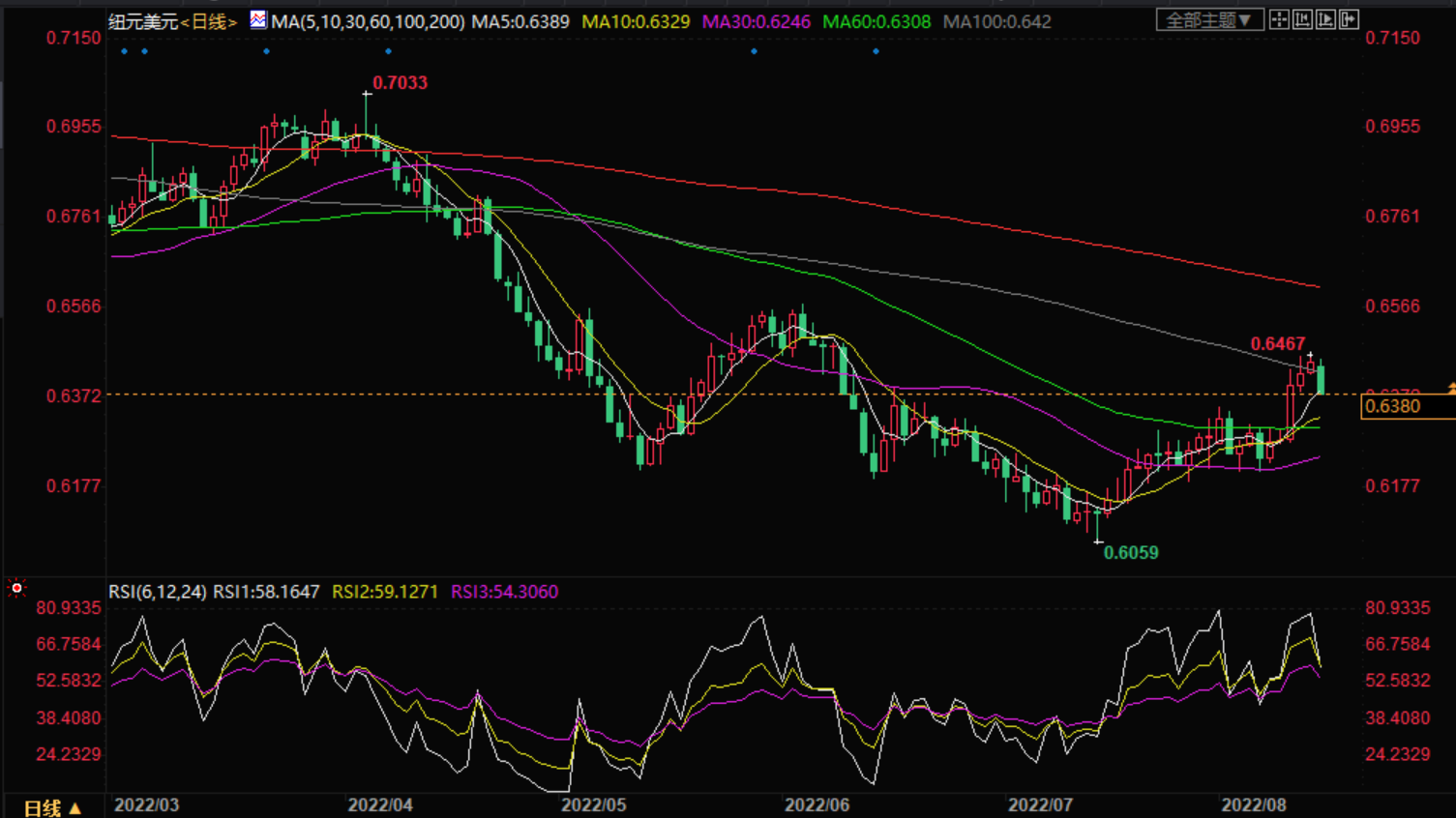 周一,纽元/美元仍刷新盘中低点0.6430附近。 基本面上,中国7月份零售销售年率降至2.7%,低于期值5.0%和前值3.1%,而工业生产(I)则从前值3.9%和期值4.6%小幅下降至3.8%。由于全球最大贸易伙伴中国的经济数据疲弱,纽元/美元出现自4月26日以来的下行倾向阻力(最新在0.6465附近)期待已久的回调。纽元/美元最新下跌也