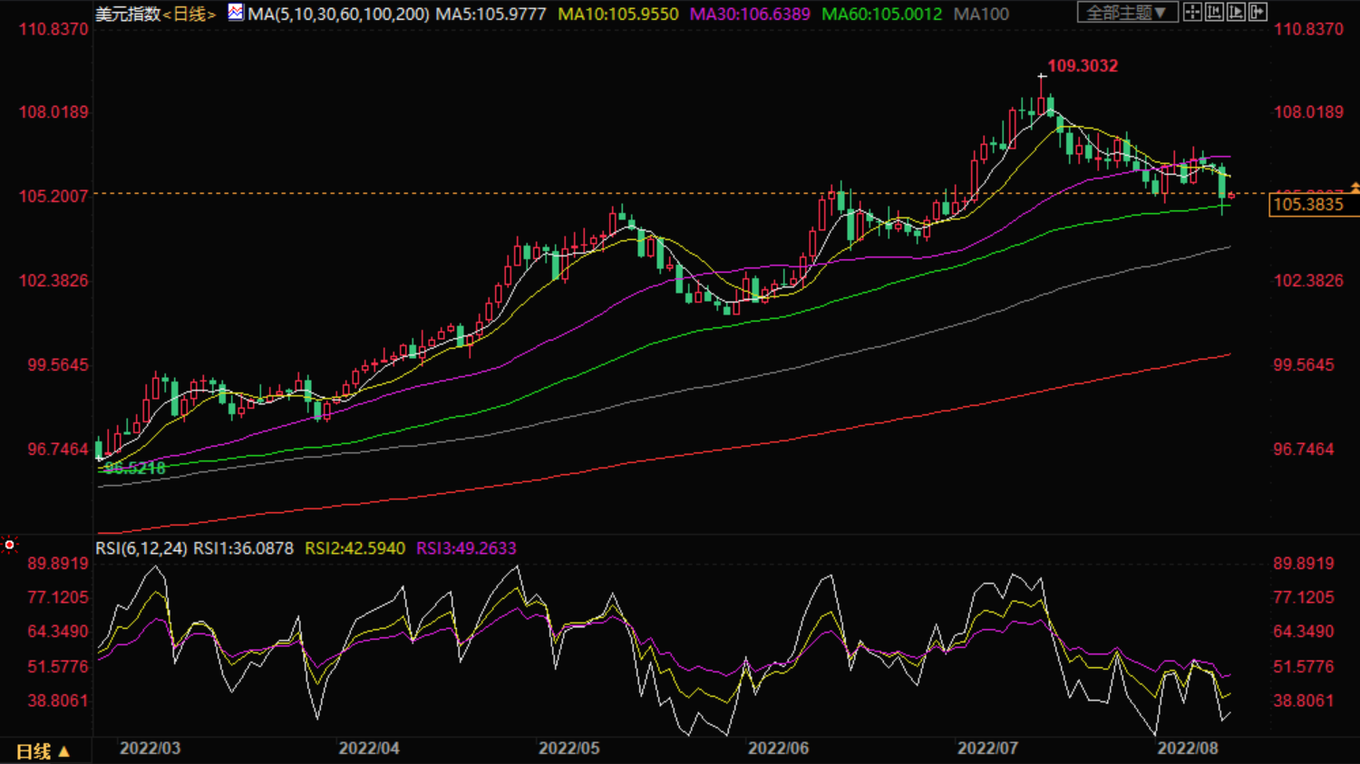 周四,美元指数在亚洲中期交易时段巩固了自3月初以来的最大单日跌幅。在这样做的过程中,美元对六种主要货币的衡量指标从美联储好坏参半的言论和围绕中国的担忧中寻找线索,以扭转美国通胀导致的损失,并刷新最晚在105.40附近的盘中高点。 美国7月消费者价格指数(CI)同比下降8.5%,预期为8.7%,前值为9.1%。数据公布