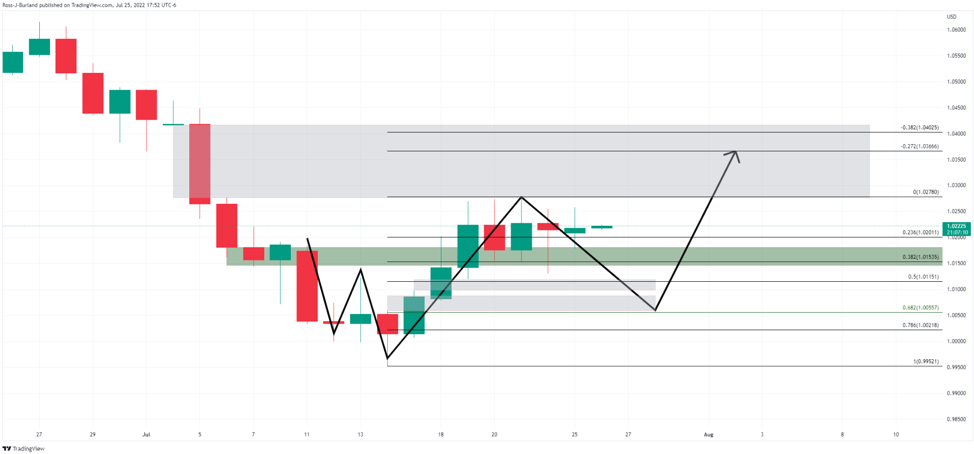 周二,欧元多头在本周开始时占据主导地位,但在这个关键时刻,他们可能会感到疲惫。 欧元/美元日线图 日线图上的w形态还没有完成对颈线的重新测试,这使得看涨冲动之后的价格失衡有可能在一定时间内得到缓解。上面的图表显示为灰色区域,并与斐波那契数列对齐,61.8%的黄金比例可能是最后一站。 欧元/美元