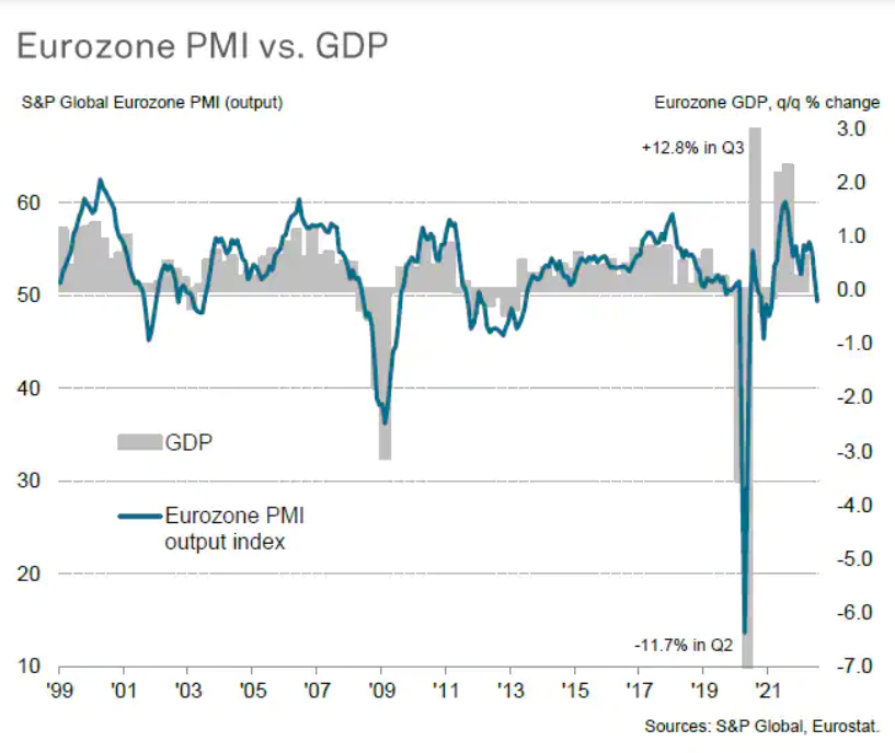 欧元区经济看来将在第三季度收缩,7月份商业活动下滑,前瞻性指标暗示,未来几个月情况将更糟。产量和新订单均出现了自2021年初COVID-19封锁以来的首次下降。与制造业加速下滑相伴的是服务业增长近乎停滞,因为生活成本不断上升继续削弱了疫情带来的被压抑需求。 对能源、供应和通胀的担忧加剧了对需求疲弱的担忧,这