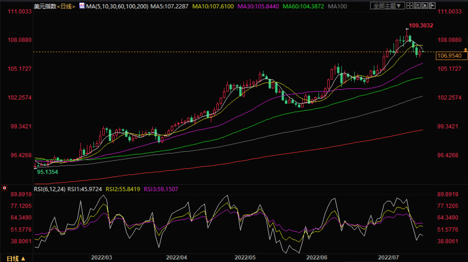 周四,美元指数在前一交易日反弹至两周低点后,目前徘徊在107.05附近。这样做,美元指标反映了市场在欧洲央行(C)的关键货币政策会议之前的优柔寡断。值得注意的是,美元指数在过去四个交易日中首次出现上涨。 美元指数的上涨可能与市场对欧洲经济衰退的担忧以及英国和加拿大强劲的通胀数据有关。支撑美元避险需求的