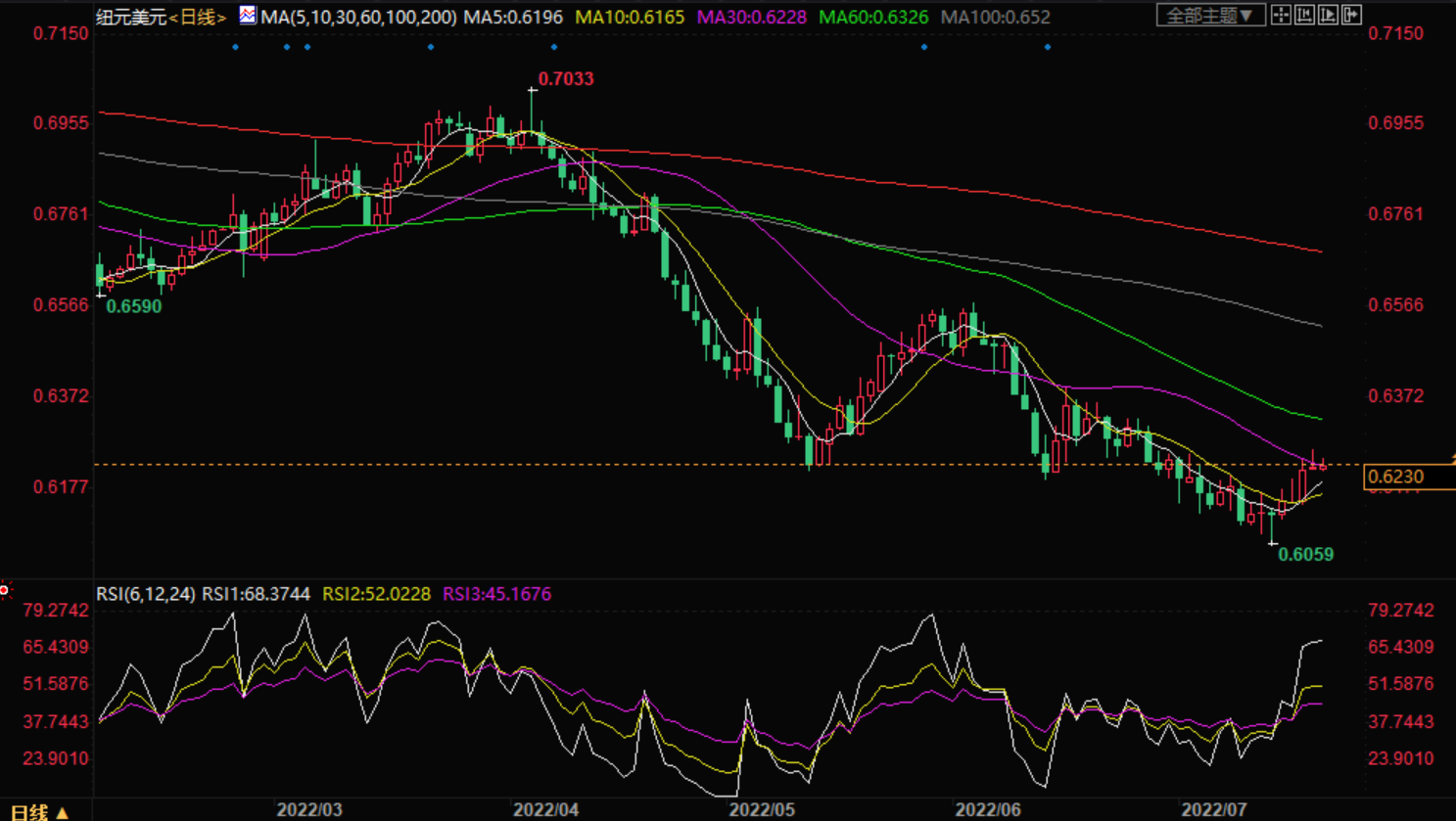周四盘中,纽元兑美元上涨至0.6230,涨幅0.06%。 基本面上,纽元/美元温和整理于0.6217后强劲飙升。纽元/美元已强劲突破0.6250关键阻力。纽元/美元上行空头提振纽元多头,展开进一步上涨空间。纽元多头提振纽元/美元上涨接近从6月6日高点0.6396到7月14日低点0.6061趋势的61.8%斐波位0.6268。 技术面上,纽元兑美元