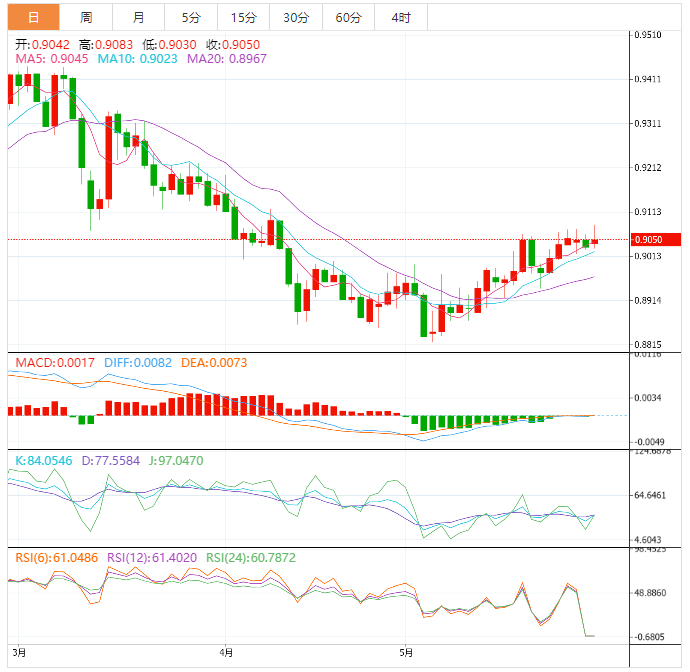 周二盘中,美元兑瑞郎上涨至0.9051,涨幅0.06%。 基本面上,美元/瑞郎数度试图突破0.9045后,出现大幅下跌。瑞郎资产吸引了大量的卖盘,因为美元指数非常不稳定,因为美国投资者在因阵亡将士纪念日而延长的周末之后正回归交易。瑞郎将在瑞士第一季度国内生产总值(GD)数据公佈后继续波动。瑞士第一季度国内生产总值
