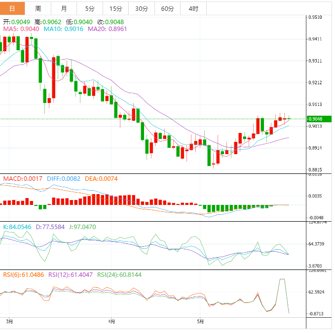 周一盘中,美元兑瑞郎下跌至0.9048,跌幅0.02%。 基本面上,美元/瑞郎在0.9000点附近维持低位。美国和瑞士市场因假期休市,该货币对难以跟随美元下跌。美元指数从10周以来的最高水平回撤,因为美国决策者公佈了关于避免"灾难性"违约措施的初步协议。然而,值得注意的是,共和党和民主党中的一些人反对这项协议,因此