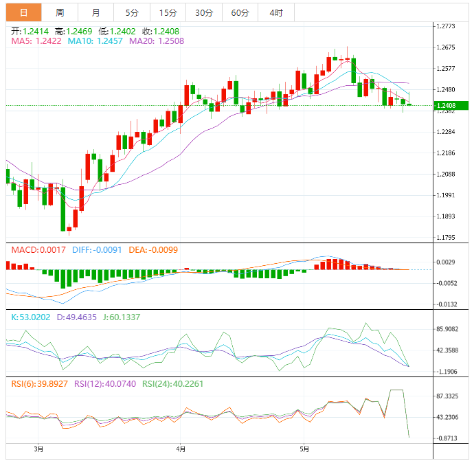 周三盘中,英镑兑美元下跌至1.2409,跌幅0.06%。 英镑基本面:英镑/美元在1.2465附近续创盘中高点,因为英国4月通胀数据增幅超过预期。美元在关键数据/事件之前的回撤,以及由于对美国违约的新的担忧,可能为英镑/美元的最新涨势增添力量。 英镑技术面:英镑兑美元显示出一些看涨倾向,重新测试了头肩形态的突破领