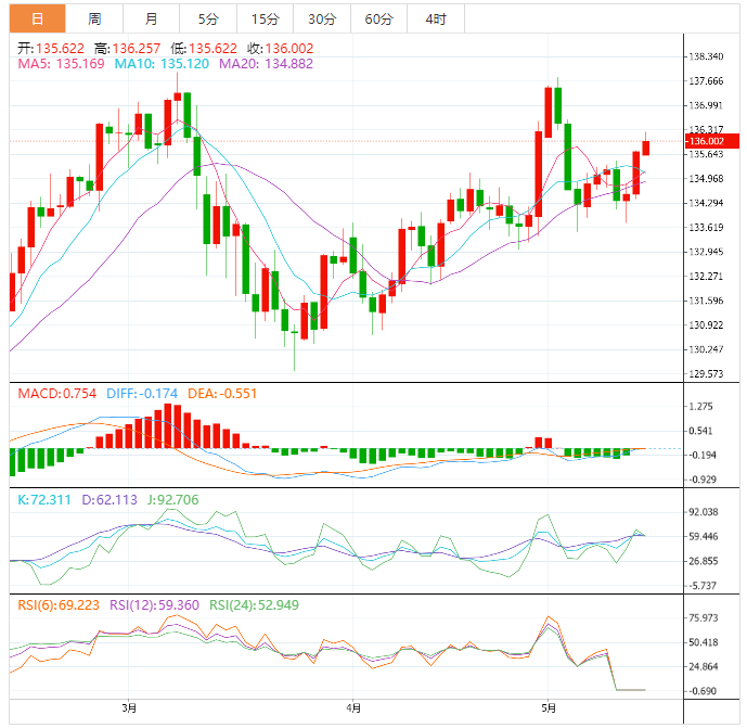 周一盘中,美元兑日元上涨至136.01,涨幅0.21%。 基本面上,美元/日元基于上周自133.75区域的上涨行情并在周一连续第三日获得一些后续牵引。不过现货价格自过去一个小时触及的1.5周高点回落数点并在欧市早盘跌破136关口。美元自周一触及的4月以来最高水平回落,成为利空美元兑日元的一大关键因素。与此同时,由于面对