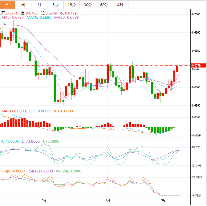 周二盘中,澳元兑美元下跌至0.6761,跌幅0.29%。 澳元基本面:澳元/美元未能延续上涨突破0.6800整数关阻力后展开整理。澳元/美元上行倾向看起来很稳固,因为下跌只是一种整理,市场参与者通常认为这是一个买入机会。澳大利亚零售销售(第一季度)季度数据公佈前,澳元处于上行状态。澳大利亚零售销售(第一季度)预期