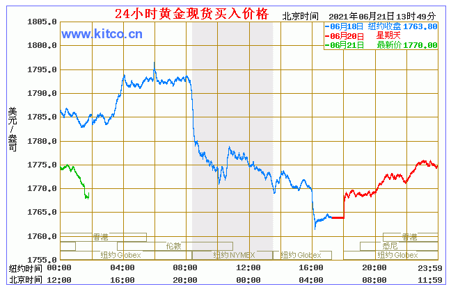 周一(6月21日)亚市盘中,美联储加息恐慌持续蔓延,亚股承压走低,美债收益率持续下行,刚刚跌破1.40%,黄金受提振站上1775美元。 今日黄金价格走势图(2021年6月21日)