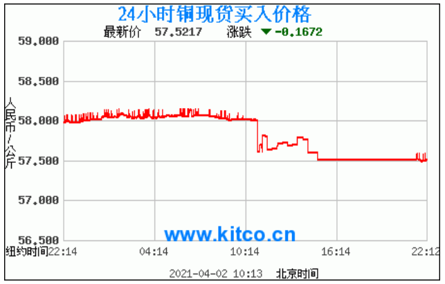 铜价格走势图今日最新铜价行情(2021年4月2日) 今日最新铜价:57.5217涨跌:-0.1672 备注:以上铜价格仅供参考,请以官方价格为准。