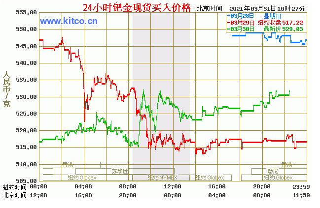 钯金价格走势图今日最新钯金行情(2021年3月31日) 今日最新钯金行情:529.83 备注:以上钯金价格仅供参考,请以官方价格为准。