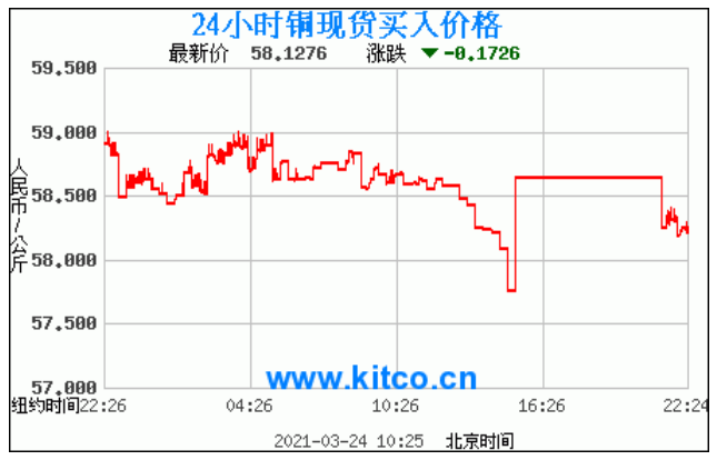 铜价格走势图今日最新铜价行情(2021年3月24日) 今日最新铜价:58.1276涨跌:-0.1726 备注:以上铜价格仅供参考,请以官方价格为准。