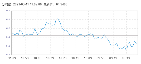 WTI原油价格实时(2021年3月11日) 名称 最新价 涨跌 涨跌幅% 开盘价 昨收价 最高价 最低价 WTI 64.94