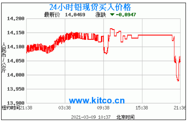 铝锭价格走势图今日最新铝锭行情(2021年3月9日) 今日最新铝锭行情:14.0469 备注:以上铝锭价格仅供参考,请以官方价格为准。