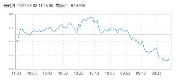WTI原油价格实时(2021年3月8日) 名称 最新价 涨跌 涨跌幅% 开盘价 昨收价 最高价 最低价 WTI 67.64