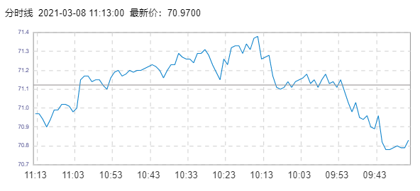 布伦特原油价格实时(2021年3月8日) 名称 最新价 涨跌 涨跌幅% 开盘价 昨收价 最高价 最低价 布伦特 71.0