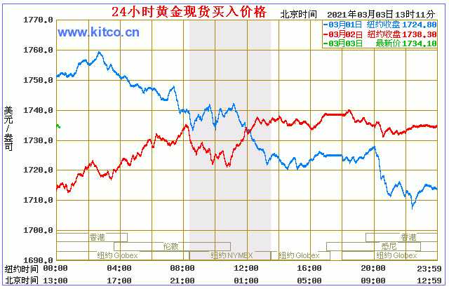 (2021年3月3日)国际黄金价格表 名称 最新价 涨跌 涨跌幅% 买价 卖价 开盘价 昨收价 最高价 最低价