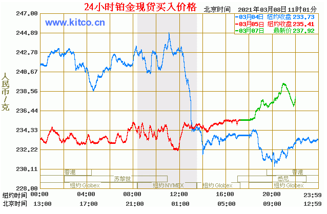 铂金价格走势图今日最新铂金行情(2021年3月8日) 今日最新铂金行情:237.92 备注:以上铂金价格仅供参考,请以官方价格为准。