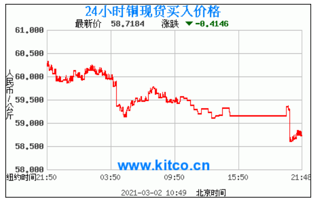 铜价格走势图今日最新铜价行情(2021年3月2日) 今日最新铜价:58.7184涨跌:-0.4146 备注:以上铜价格仅供参考,请以官方价格为准。