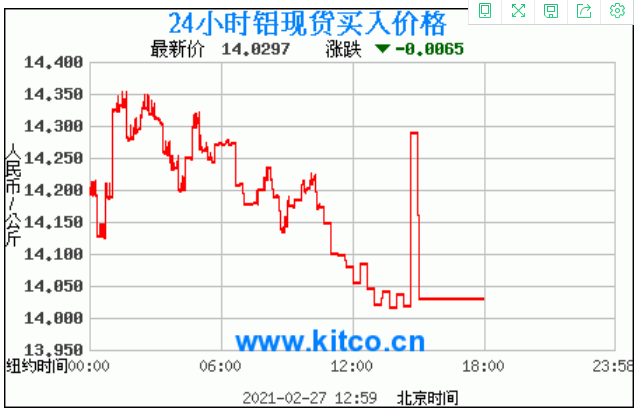 铝锭价格走势图今日最新铝锭行情(2021年3月1日) 今日最新铝锭行情:14.0297 备注:以上铝锭价格仅供参考,请以官方价格为准。