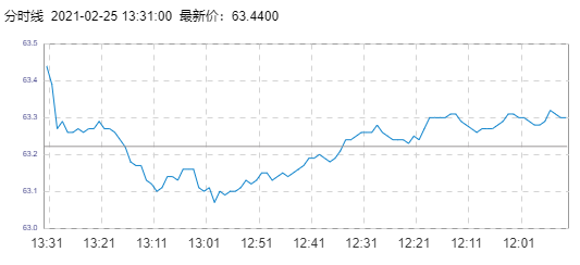 WTI原油价格实时(2021年2月25日) 名称 最新价 涨跌 涨跌幅% 开盘价 昨收价 最高价 最低价 WTI 63.27