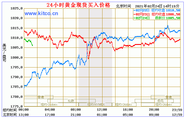 周三(2月24日),现货黄金价格小幅上涨,因美联储主席鲍威尔表示,美国经济仍需支持,货币政策将保持宽松。但美元指数探底回升,限制了金价升幅。金价上方阻力位在1830美元。北京时间13:52,现货黄金上涨0.16%至1808.46美元/盎司;美元指数上浮0.01%至90.133。 今日黄金价格走势图(2021年2月24日)