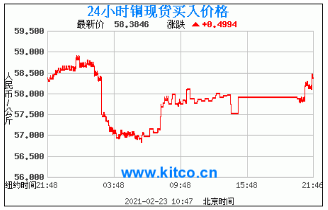 铜价格走势图今日最新铜价行情(2021年2月23日) 今日最新铜价:58.3846涨跌:0.4994 备注:以上铜价格仅供参考,请以官方价格为准。