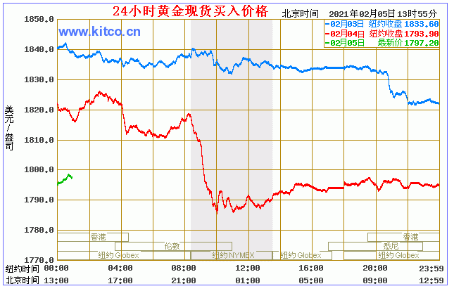 周五(2月5日)现货黄金几乎持稳,交投于1800下方。多头反弹力量薄弱,基本面与技术面都利空金价,金价的任何反弹都可能是空头逢高做空的机会。 今日黄金价格走势图(2021年2月5日)