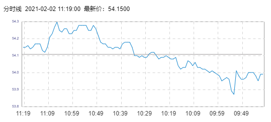WTI原油价格实时(2021年2月2日) 名称 最新价 涨跌 涨跌幅% 开盘价 昨收价 最高价 最低价 WTI 54.15