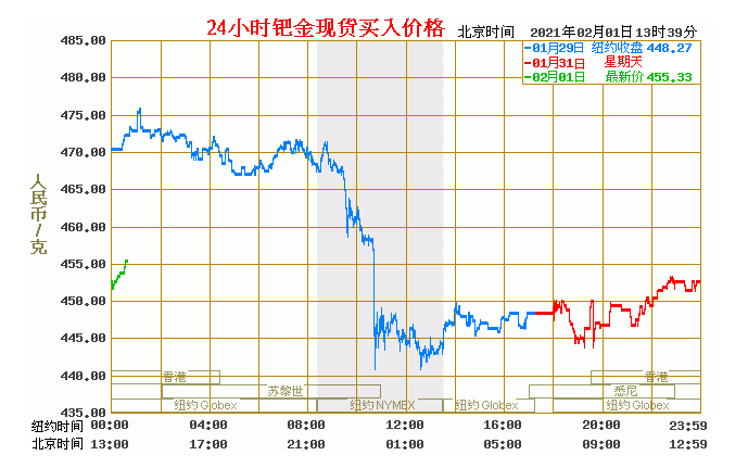 钯金价格走势图今日最新钯金行情(2021年2月1日) 今日最新钯金行情:455.33 备注:以上钯金价格仅供参考,请以官方价格为准。