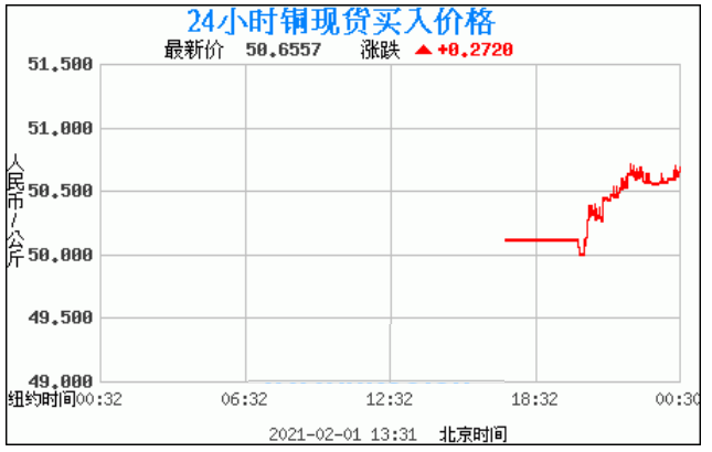 铜价格走势图今日最新铜价行情(2021年2月1日) 今日最新铜价:50.6557涨跌:0.2720 备注:以上铜价格仅供参考,请以官方价格为准。
