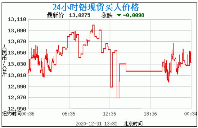 铝锭价格走势图今日最新铝锭行情(2020年12月31日) 今日最新铝锭行情:13.0275 备注:以上铝锭价格仅供参考,请以官方价格为准。