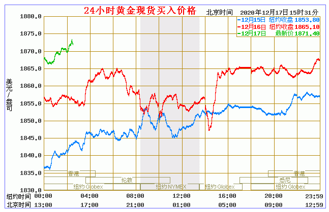周四(12月17日)现货黄金微涨,交投于1866附近,周三(12月16日)金价涨0.6%至1864.8美元/盎司,之前美联储主席鲍威尔表示美国非常需要财政政策,且美联储在通胀回到正常轨道之前不会先发制人地加息。另外,美国会纾困案接近达成协议以及美国经济数据不佳也帮助金价继续上涨,利多金价的因素盖过了新冠疫苗接种乐观情绪带来