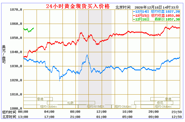 周三(12月16日)现货黄金走高,创一周以来新高,交投于1857附近,周二(12月15日)金价涨1.44%至1853.63美元/盎司,受美国将出台新一轮新冠援助计划的预期提振,与此同时,感染病例不断增加再次引发人们担忧疫情造成的经济损失。 今日黄金价格走势图(2020年12月16日)