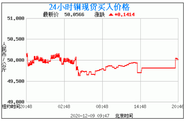 铜价格走势图今日最新铜价行情(2020年12月9日) 今日最新铜价:50.0566涨跌:0.1414 备注:以上铜价格仅供参考,请以官方价格为准。