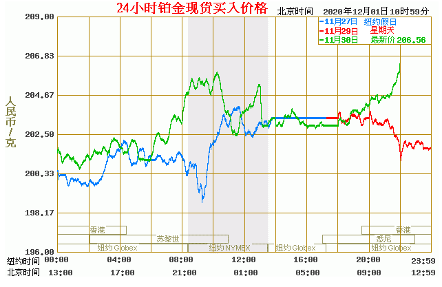 铂金价格走势图今日最新铂金行情(2020年12月1日) 今日最新铂金行情:206.56 备注:以上铂金价格仅供参考,请以官方价格为准。
