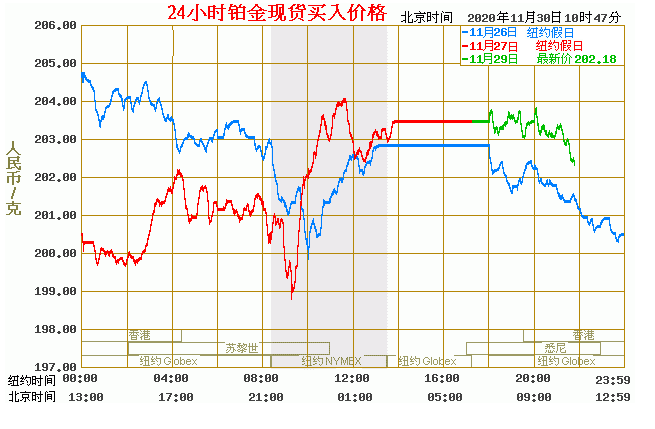铂金价格走势图今日最新铂金行情(2020年11月30日) 今日最新铂金行情:202.18 备注:以上铂金价格仅供参考,请以官方价格为准。
