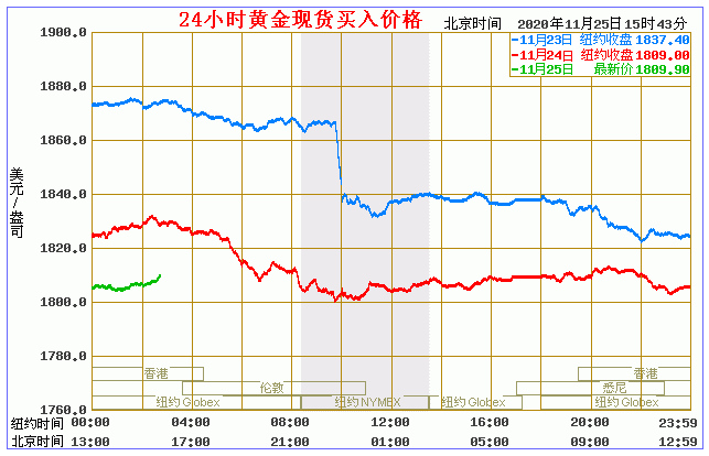 (2020年11月25日)国际黄金价格表 名称 最新价 涨跌 涨跌幅% 买价 卖价 开盘价 昨收价 最高价 最低价